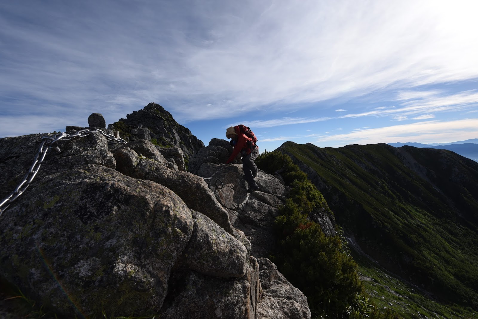 山頂近くは高度感のある岩場が続き、「山と高原地図」では点線で示されるバリエーションルートとなっています。よくよくネットで調べてみると点線ルートといっても鎖はしっかりつけられていて、自分の実力でなんとか登れそうだという事がわかりました。ただ、険しい道であることに変わりはなく、間違いなく今まで登ったどの道よりも危険度と難易度は高いので気を引き締めて登山に臨みました。